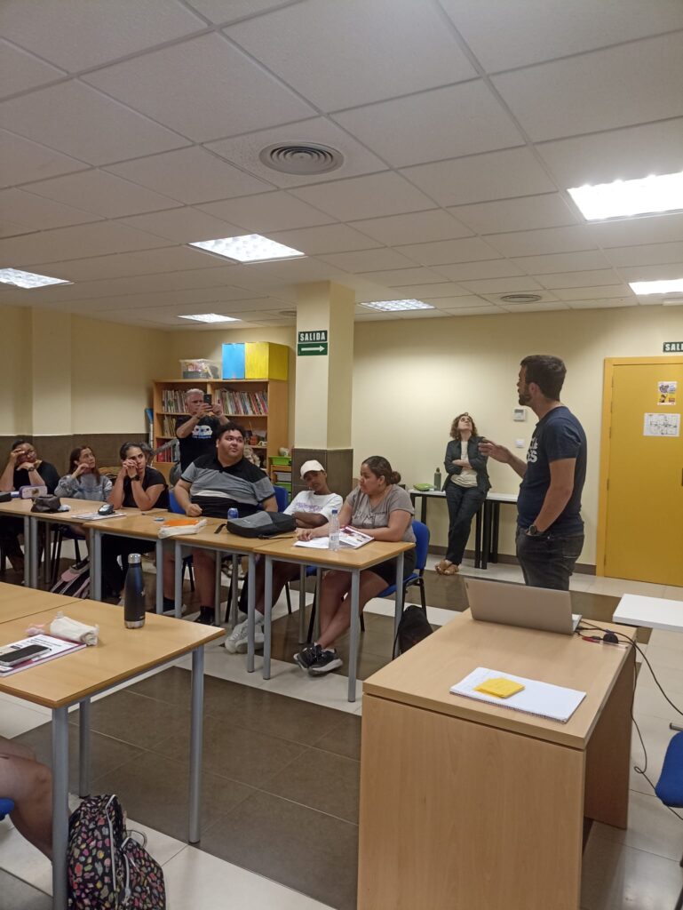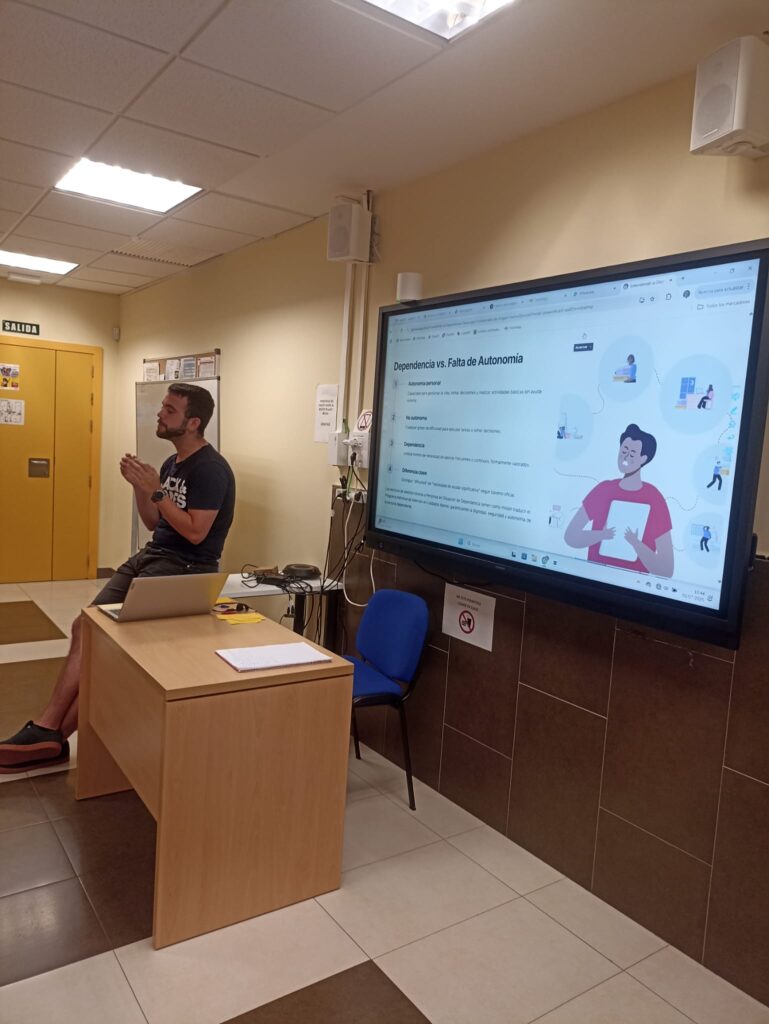 El día 2 de julio compartimos aula con el alumnado-trabajador del PEEF Kairós Sociosanitario y vienen a impartirnos una charla sobre Servicios Asistenciales a personas con discapacidad. Adrían, técnico del Centro Ocupacional de San José nos clarifica si cabe aún más temas tan importantes como el concepto de Dependencia versus concepto de Discapacidad entre otros.